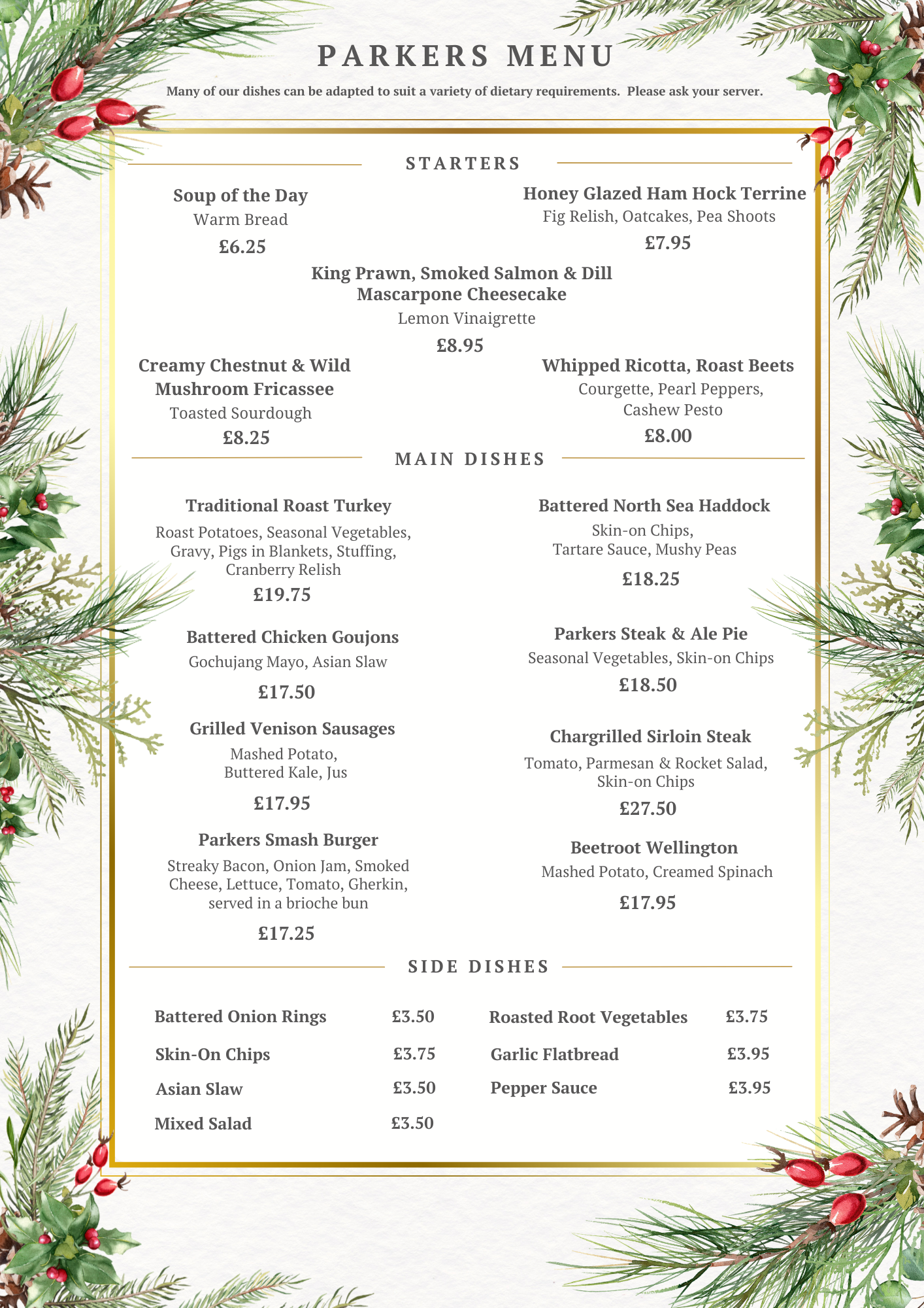 Click on the links below to view sample menus from our Parkers restaurant.